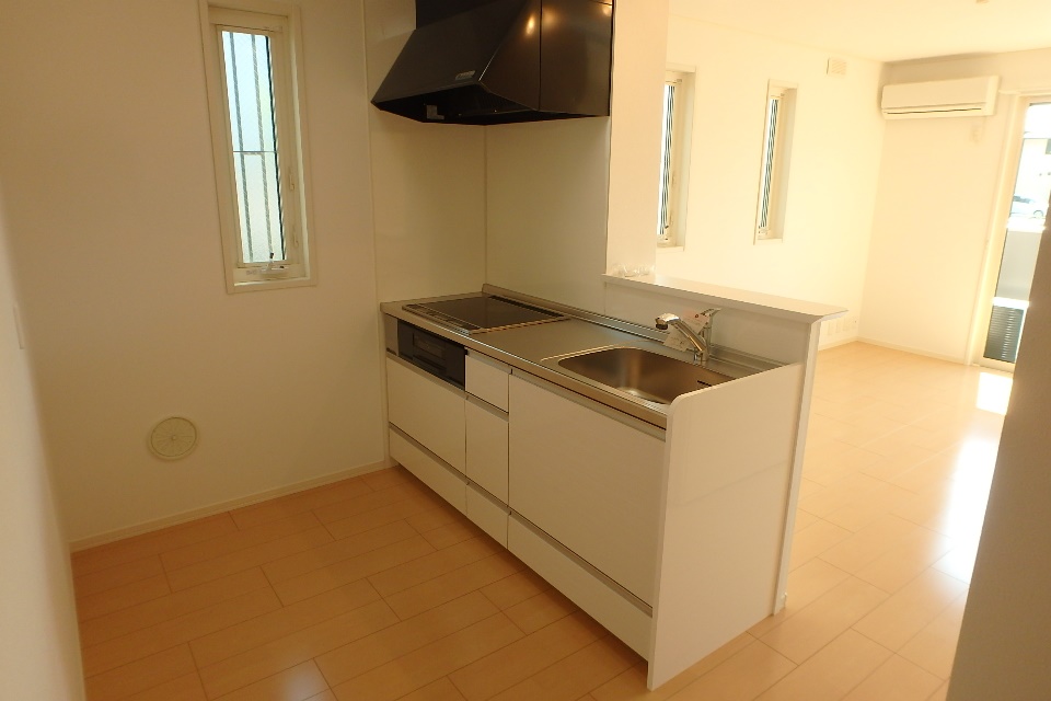 キッチンはカウンタータイプです。シャワーヘッドで伸縮自在のシングルレバー水栓です。