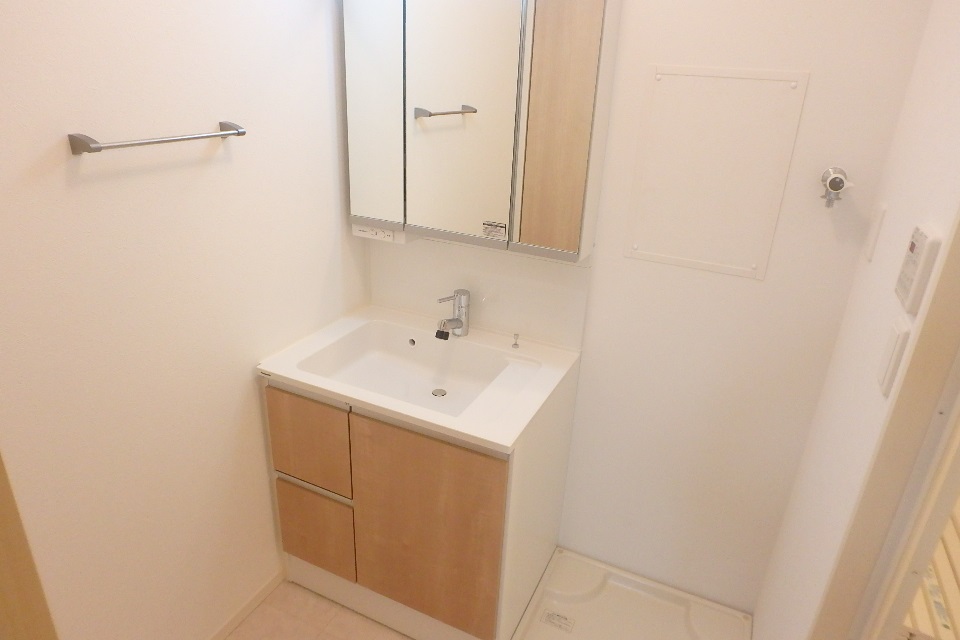 三面鏡の独立洗面台です。くもり防止加工が施されております。