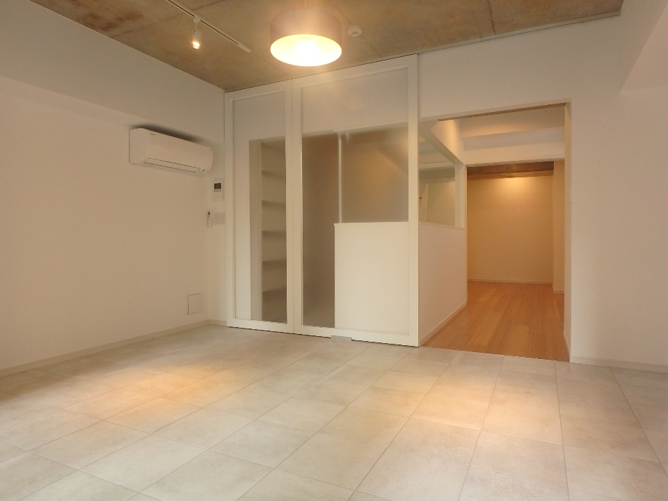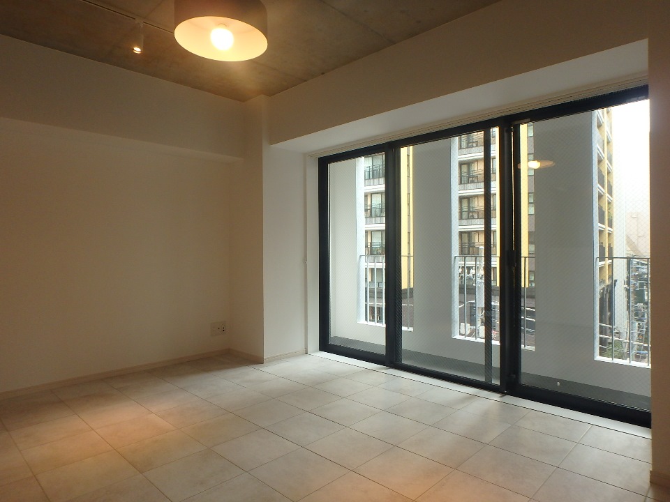 東向きのバルコニーに面して、8.5帖の洋室があります。床はタイルタイプ、天井部にコンクリート打ちっぱなし&スポット照明などクールな印象のお部屋です。