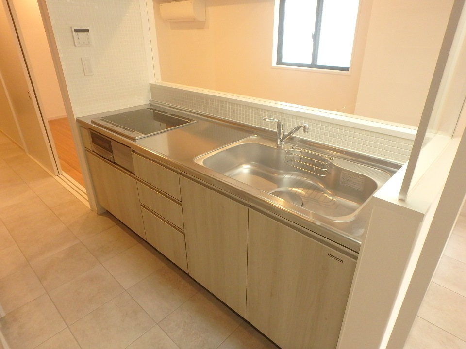 3口のIHヒータ式のシステムキッチンです。対面部をガラスで仕切っており、料理のにおいがお部屋に流れません。また、キッチンの引き出しはソフトクローズ。ゆっくり閉まるので、指をはさんだりしません。