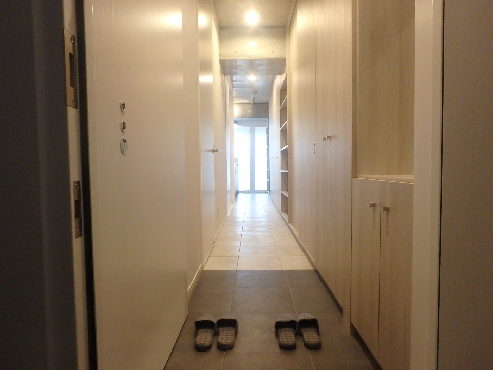 玄関口からの写真です。右手側の壁は、すべて収納スペースとなっております。建具とフローリングの色は、3階から5階がバンブー、6階以降はブラックウォルナットになります。