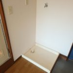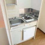 ▼ガスコンロのシステムキッチンです。まな板を置くための作業スペースはありませんが、簡単な調理なら工夫すれば大丈夫。ミニ冷蔵庫がありますが、別に冷蔵庫を置くためのスペースも確保されているのです。(意外とミニ冷蔵庫付きの物件にはコレがないのですよ・・・)