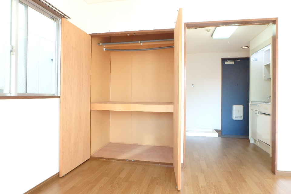 ▼バルコニー側から室内を撮影。台所スペースとお部屋の間が扉で仕切られていないのでワンルームタイプに分類されますが、こちらのお部屋は突っ張り棒をカーテンレールのように利用すれば、簡単に仕切ることができます。