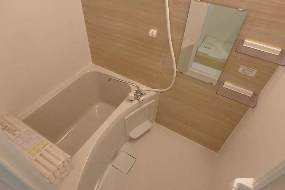カラーパネルでアクセントの効いたバスルーム。毎日のことだからこそ、ちょっぴりリッチ感を味わえます。