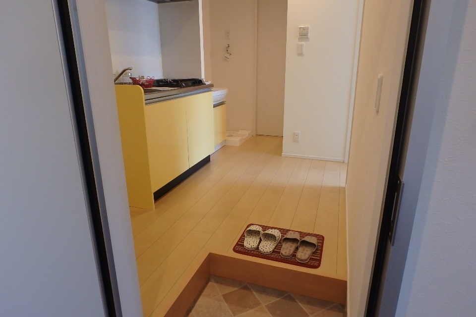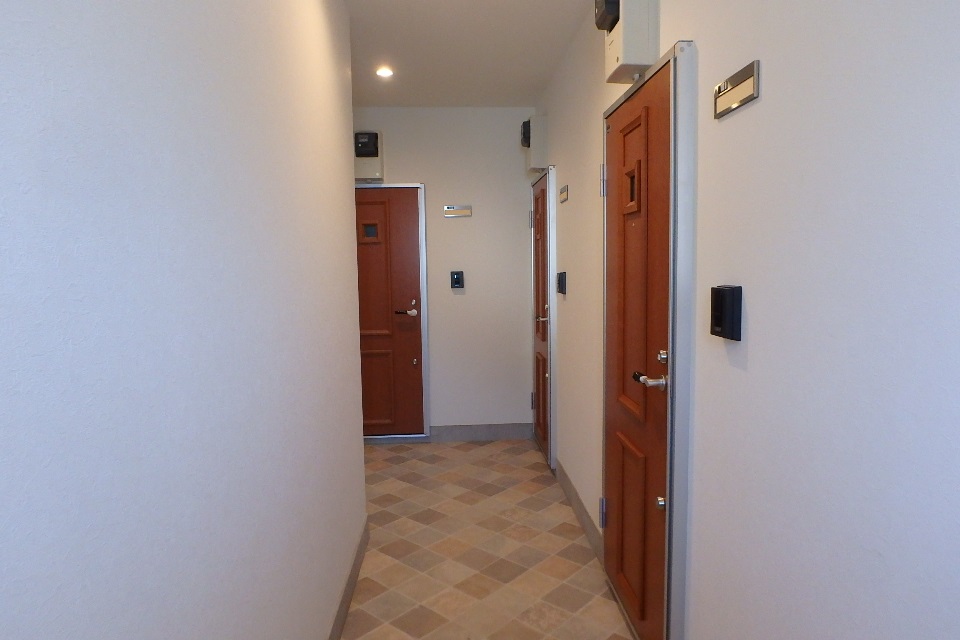 オートロックで施錠されたエントランス扉を入ると、各戸の玄関扉があります。不要な訪問者を建物内に入れず、ゴミが共用廊下に舞い込まないのが特徴です。