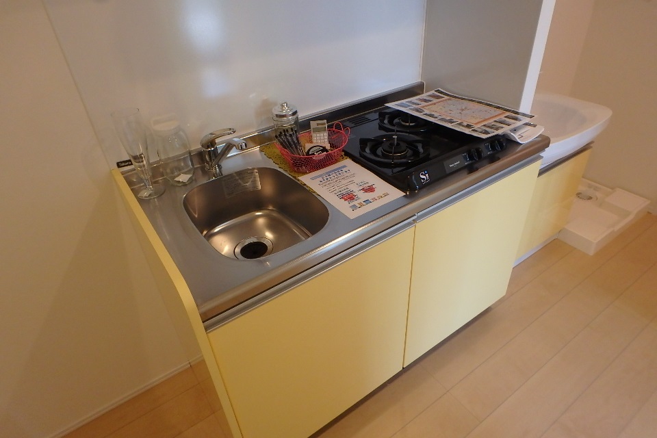 1Kタイプの間取りで、廊下にガスコンロのシステムキッチンがあります。