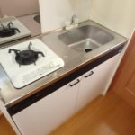 ▼システムキッチンはガスコンロタイプ。火力が必要な調理に適しています。キッチン脇には冷蔵庫が置けるスペースもあります。