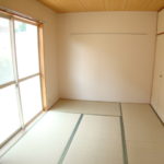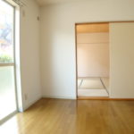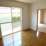 ・南側の面が長い居室なので、部屋全体が明るい雰囲気。縦長の居室と比較して、奥まで光が差し込みます。ですから、部屋全体が明るいのです。収納スペースも、洋室と和室にそれぞれあります。(全部で1間半の大きさです。 ※1間≒180㎝)