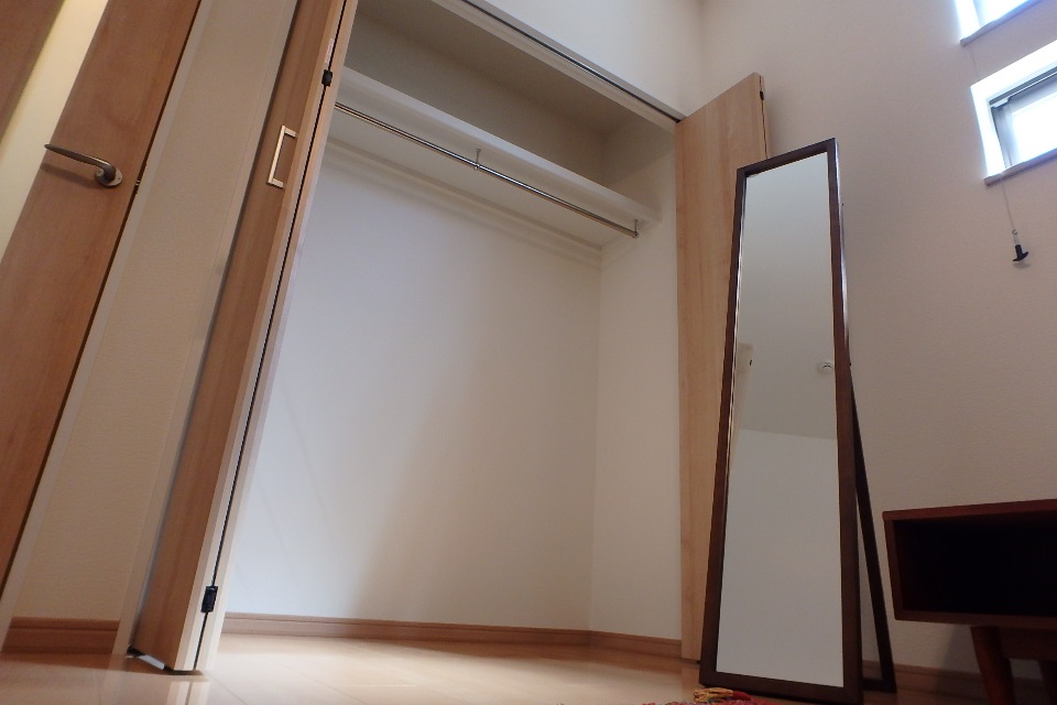クローゼットも大容量。扉の開閉に邪魔にならないようスタンドミラーを配置。