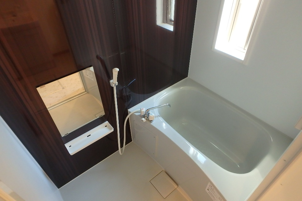 窓のあるバスルーム。ほんのりグリーンの上品な浴槽。浴室乾燥機もついています。