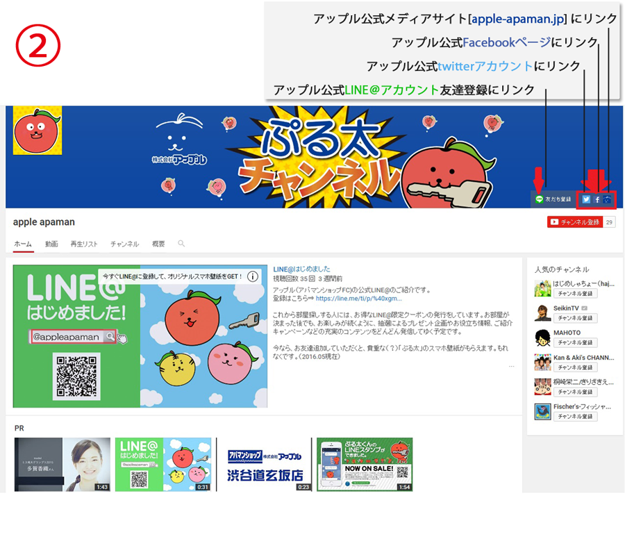 YouTubeチャンネルのトップページの一番上の「チャンネルアート」と言われる部分なのですが、アップル運営しているSNSや、このメディアサイトのURLを埋め込みました。