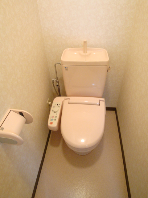 トイレは温水洗浄便座。清潔感のある白を基調とした壁紙をつかっております。