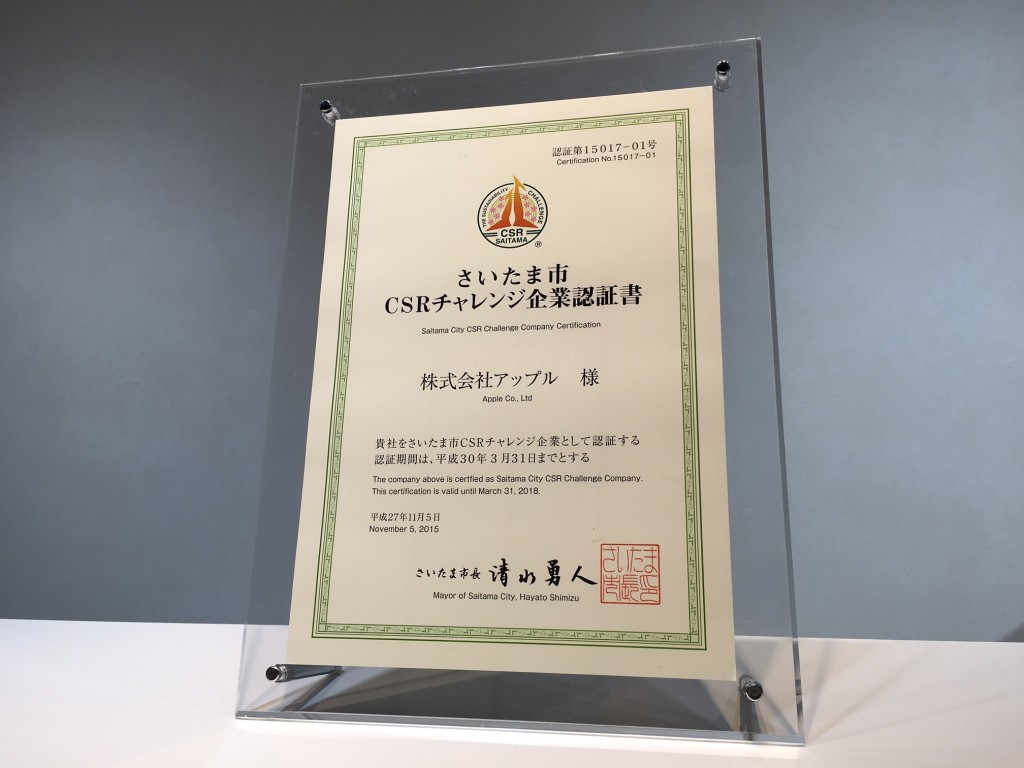 さいたま市より「さいたま市CSRチャレンジ企業」として認証されましたので、ご報告申し上げます。