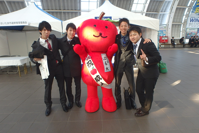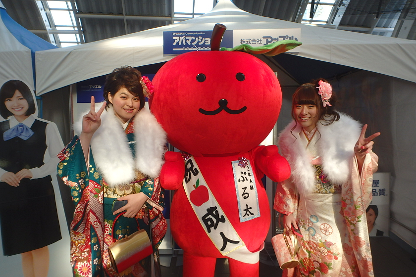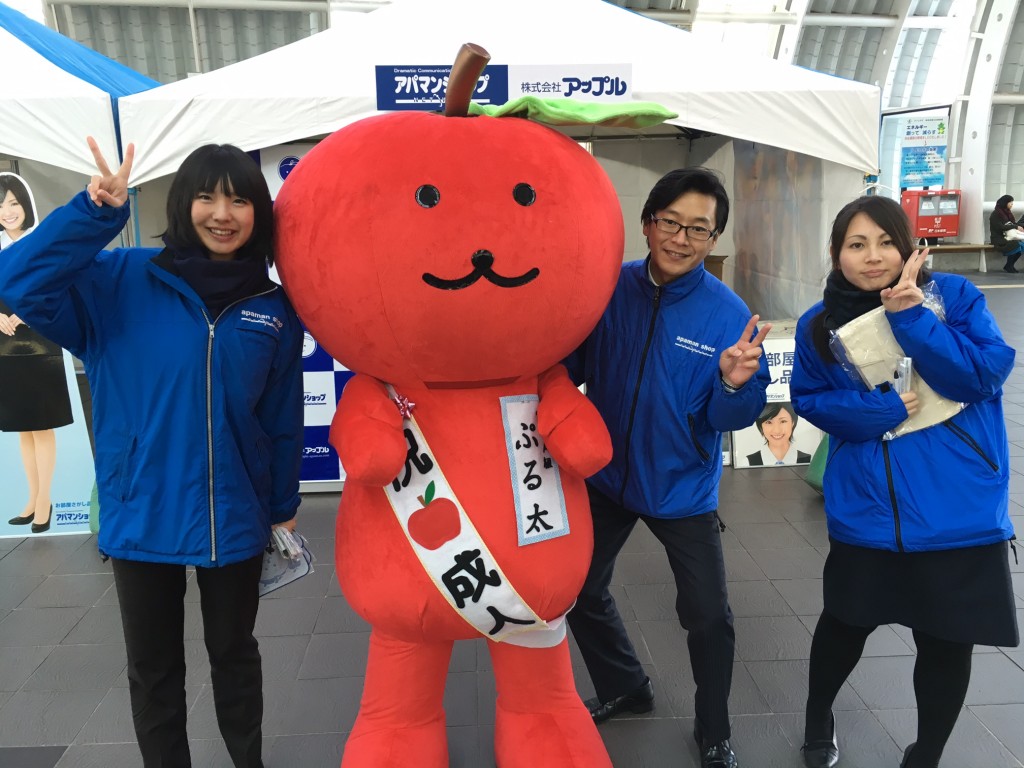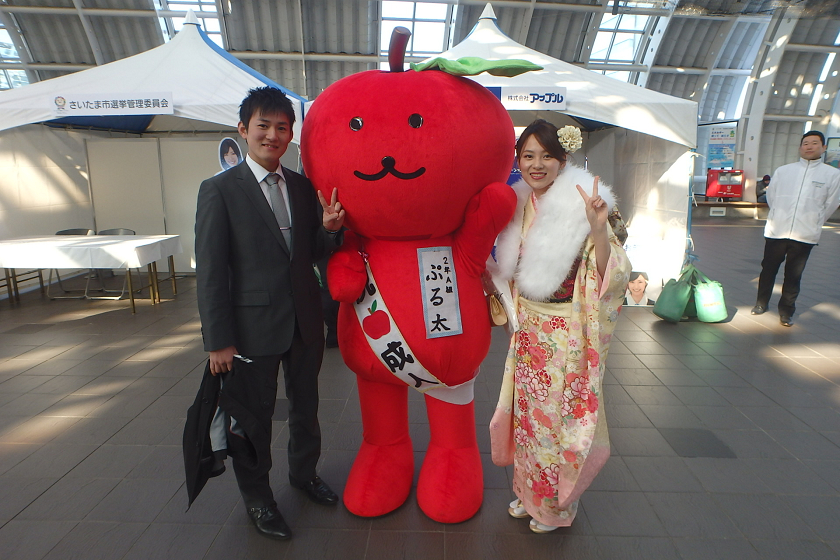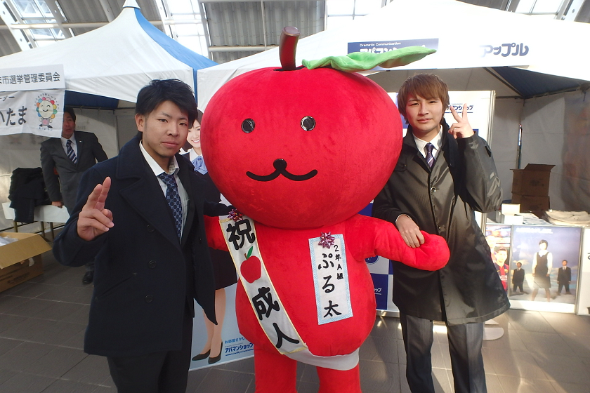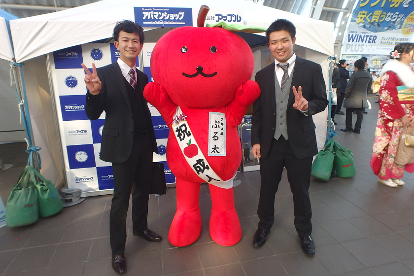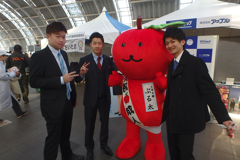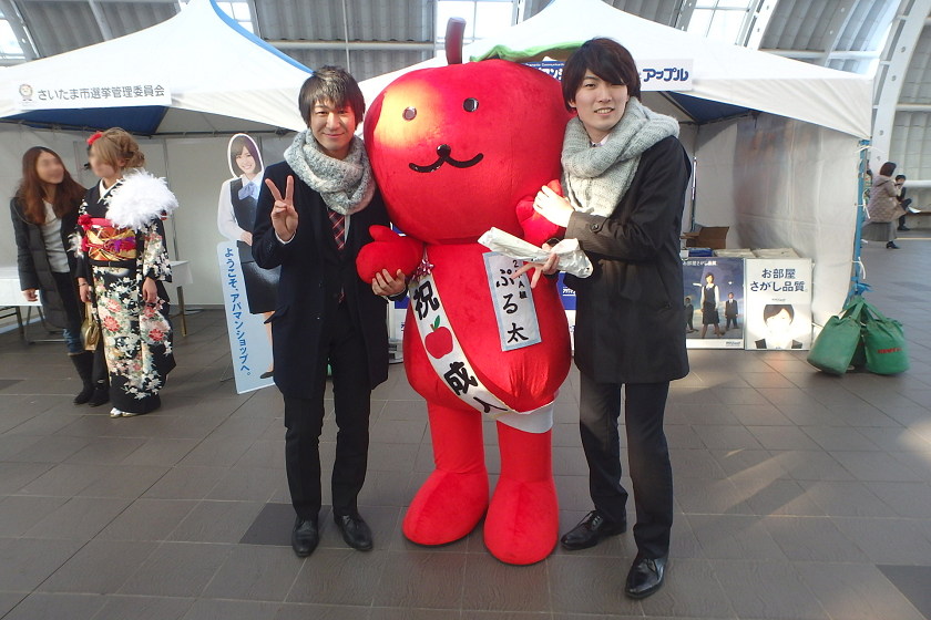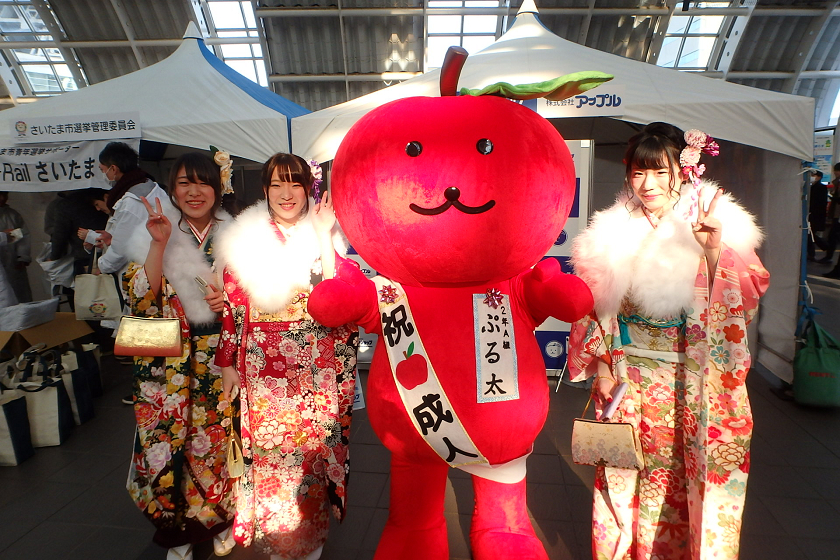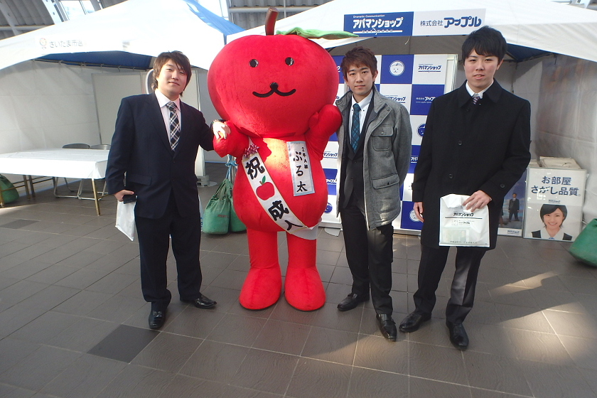 当社、株式会社アップルでは、さいたま新都心駅の改札付近のイベント会場にブース出展させていただきました。当社の公式キャラクター「ぷる太」と新成人のみなさんと記念撮影大会を開催いたしました♪