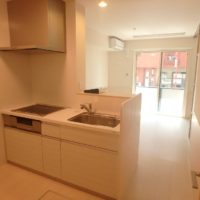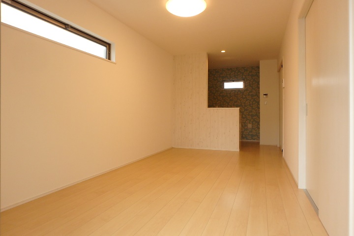 ▼ バルコニー側から撮影しました。対面式のキッチンとなっていて、奥の壁紙は1階と2階でデザインが異なります。