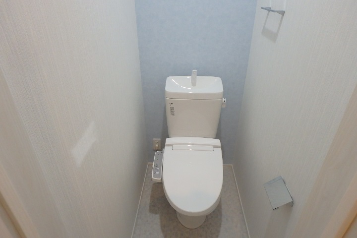 ▼ 清潔感のあるトイレ。奥の壁紙の色がフロアによって違います。写真は1階のトイレ。