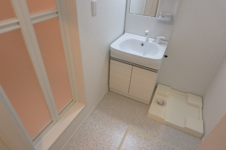 ▼ シャワー付きの独立洗面台を備えた脱衣所。ここでもフロアによって床材のデザインが異なります。