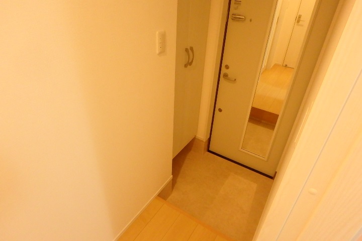 ▼ 姿見鏡のついた機能的な玄関扉。防犯性の高い鍵穴2つのダブルロックです。