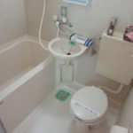 ▼トイレとお風呂、洗面台が一体化した3点ユニットバス。テープが貼られているのは、修理跡ではありません。水を使わないと臭いや虫が上がってくる恐れがあるので、隙間を埋めているのです。