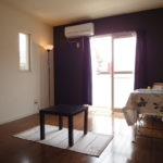 ▼バルコニー側の壁紙は、濃紺でさわやか♪生活がイメージしやすいようカーテンや家具を配置してありました。