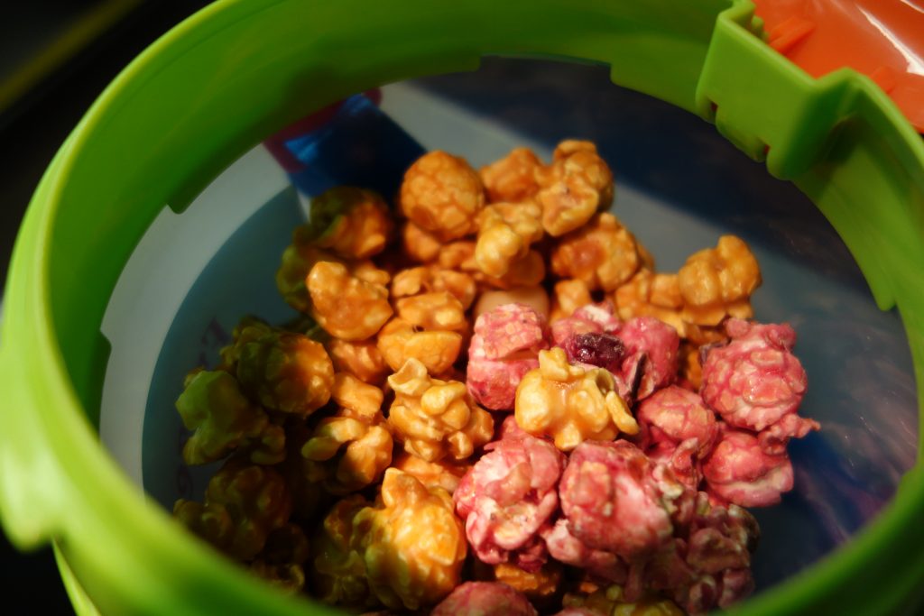 何種類のもポップコーンが、アイスクリームのケースみたいなものに彩り鮮やかに並んでいます。