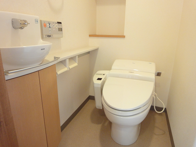 ▼玄関口です。そばにバルコニーがあり、明るくて開放的です。 ▼リビングです。広いリビングには掘りごたつがあります。 ※画像ギャラリーにアップ写真を入れてます。 ▼3口ガスコンロの対面型システムキッチン。 ▼リビングの奥は、和室です。写真上部に見えるのは、天井付のエアコンです。 ▼独立洗面台も大きめ。便利な三面鏡が嬉しいですね♪ ▼大きな鏡が素敵なバスルーム。窓があり、窮屈さがありません。 ▼ウォシュレットタイプのトイレ。専用の手洗いがありますよ。