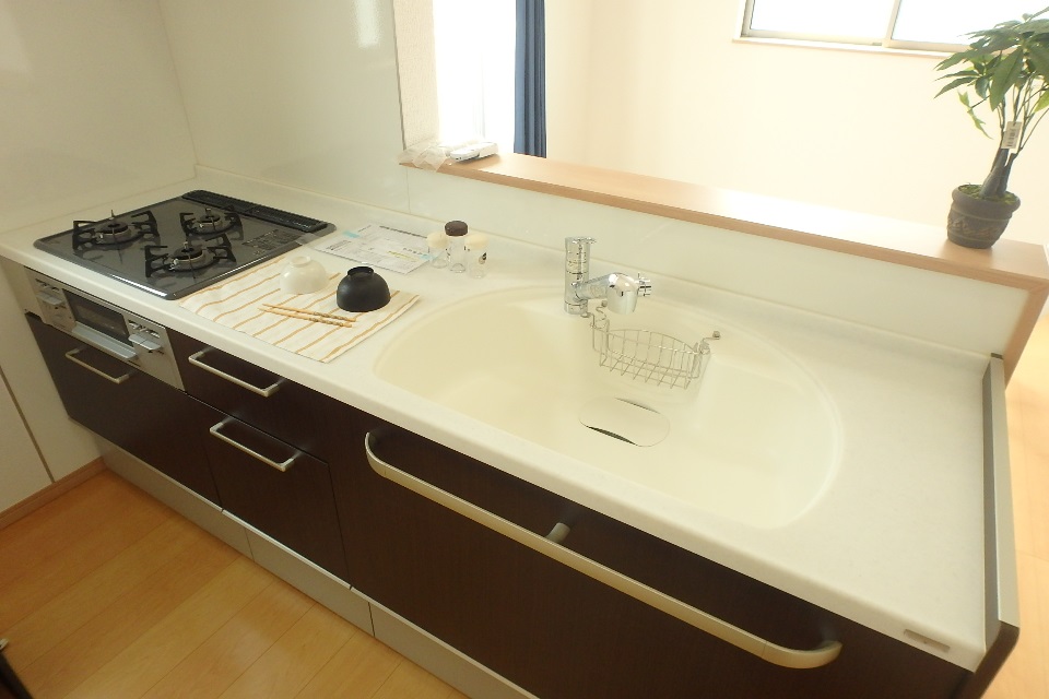 キッチンは大容量シンク、3口ガスコンロの対面式。シンク下の引出しは大容量の上、指を挟まないようソフトクローズ(ゆっくり閉まる)タイプです。