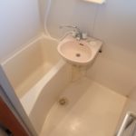 ▼洗面台付きのバスルームです。シャワー派の方が増えているようですが、たまに浴槽にゆっくりつかると疲れもとれますよ。