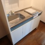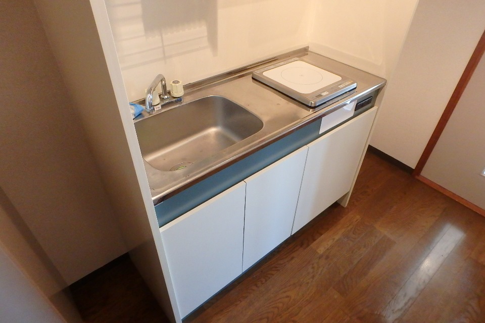 ▼302号室のキッチンはIHクッキングヒーターにリフォームされていました。もともとは電気コンロだったようです。見た目にスッキリ、掃除も簡単です。冷蔵庫を置くスペースも確保されています。