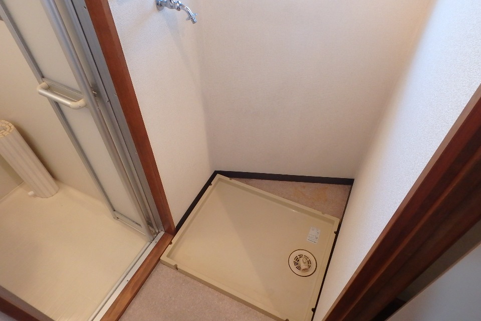 ▼洗濯機置場はお風呂の手前の小部屋にあります。洋服を脱いで、そのまま洗濯機に入れられます。写真には写っておりませんが、給水蛇口の上部にタオル置きがあります。小窓があるので空気の入れ替えも簡単です。